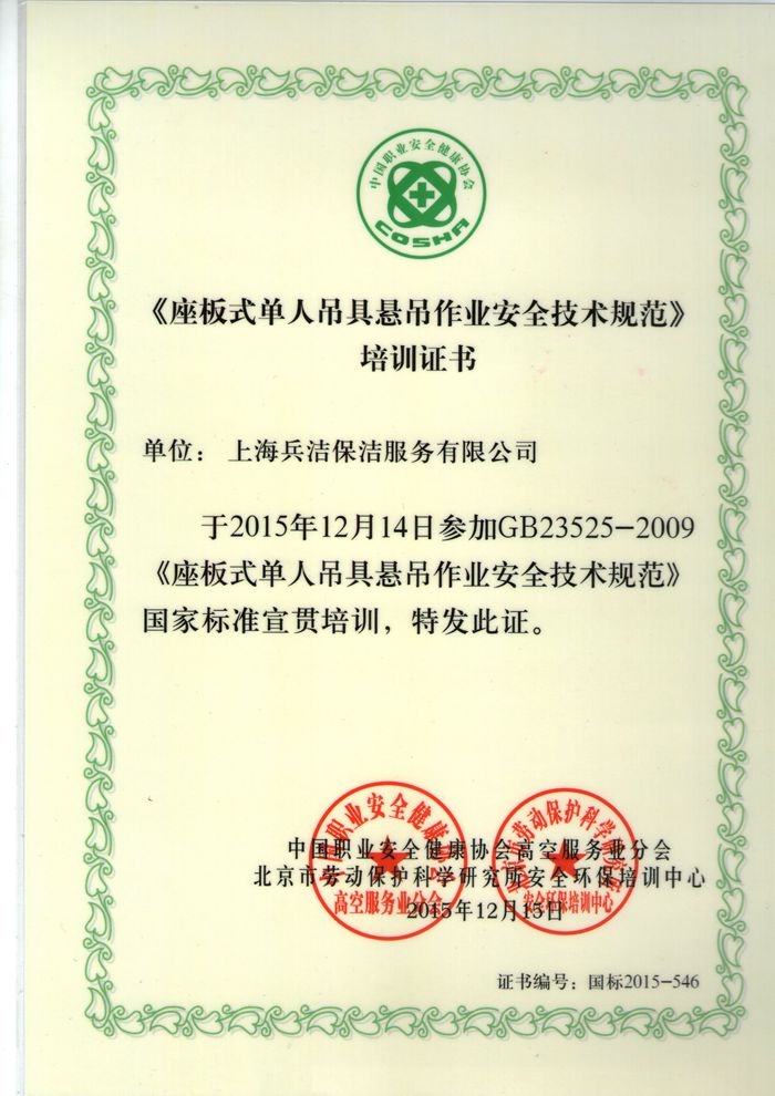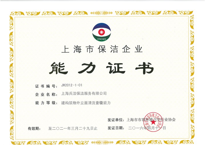 上海兵潔環境服務有限公司成立于2005年9月,專業從事外墻清洗、內(外)墻粉刷、開荒清潔、石材翻新養護、外墻維修、地毯清洗,辦公樓、住宅樓、商場、工廠、賓館、醫院、展覽展示館等各類物業場所的日常保潔服務。公司現有員工1200余人,服務項目200多個,其中外墻清洗服務面積1500多萬平方米,日常保服務面積500多萬平方米。公司秉承“誠信務實、安全高效、吃苦耐勞、勤勉細致” 的企業作風和“專業來自敬業,服務創造品質”的基本理念,全面導入ISO9001:2008質量管理體系認證證書,ISO14001:2004環境管理體系認證證書,OHSAS18001:2007